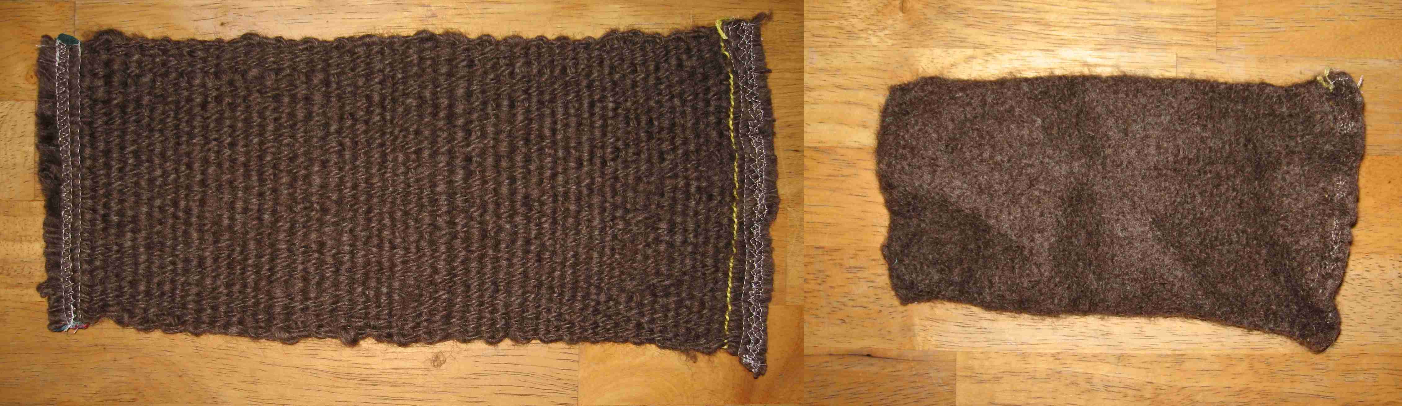 After I took the wool fabric off the loom, I sewed down the ends and ran it through the washer and dryer a few times to felt it. You can see it shrank quite a bit as it felted.