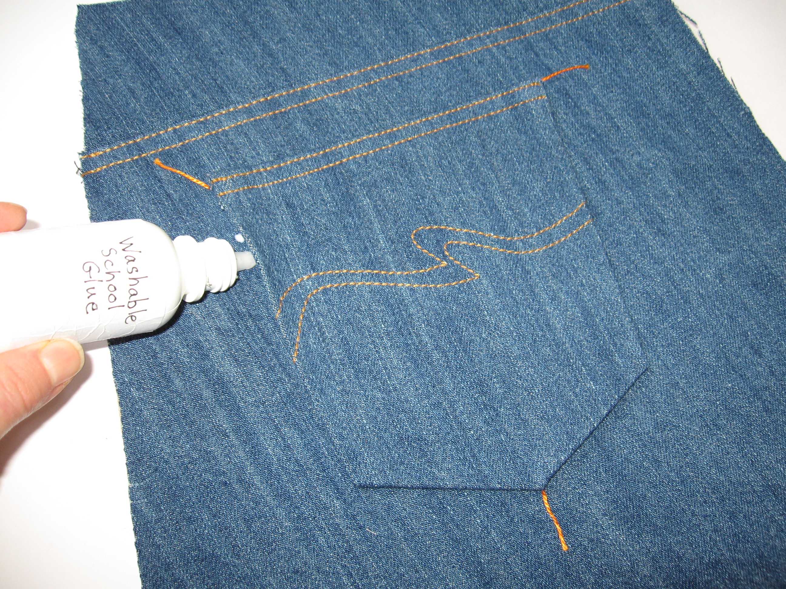 9. Hem your pocket. I used a blind hem foot and a 1/4″ foot for the hem. Glue the pocket to the jeans. Press the glue dry.