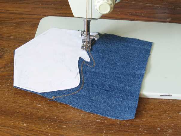 1. Cut out templates for the decorative stitching from heavy paper. Use double sided tape to stick them to the pocket. Stitch along the edge of the guide.