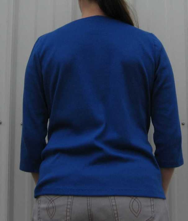 This blue fabric is a vintage poly/cotton blend that I picked up at a thrift store. It’s a 1×1 rib knit with no vertical stretch, but stretches easily crosswise. This fabric worked quite well for this pattern. I can’t stand the feel of polyester, so I’m not sure I’ll be able to actually wear this shirt, but it worked well as a muslin.