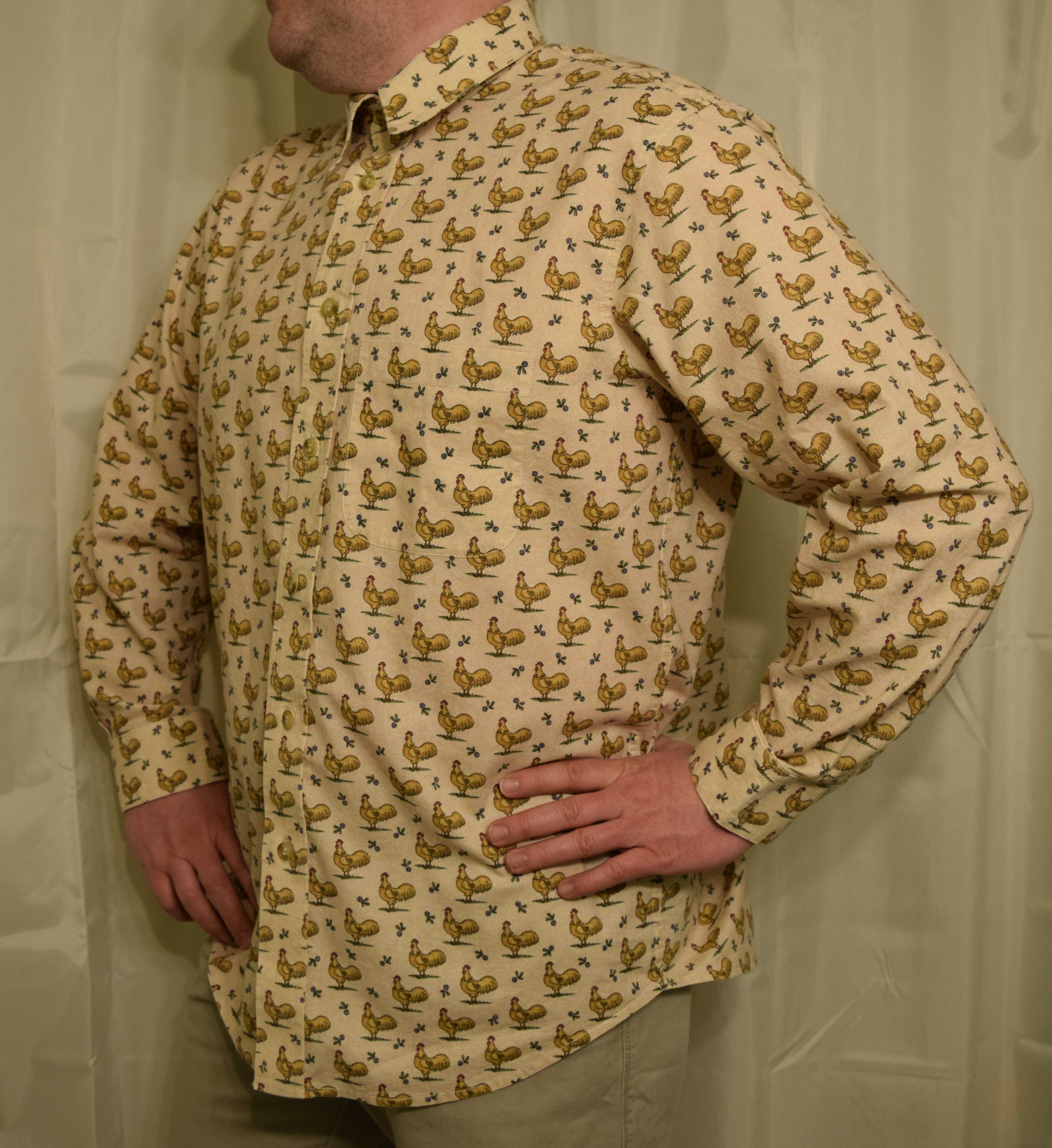 The shirt is awesome and it fits him very nicely. Just think that artsy people in New York city would pay through their noses to get their hands on rooster shirts like this one. Your husband might start a trend!