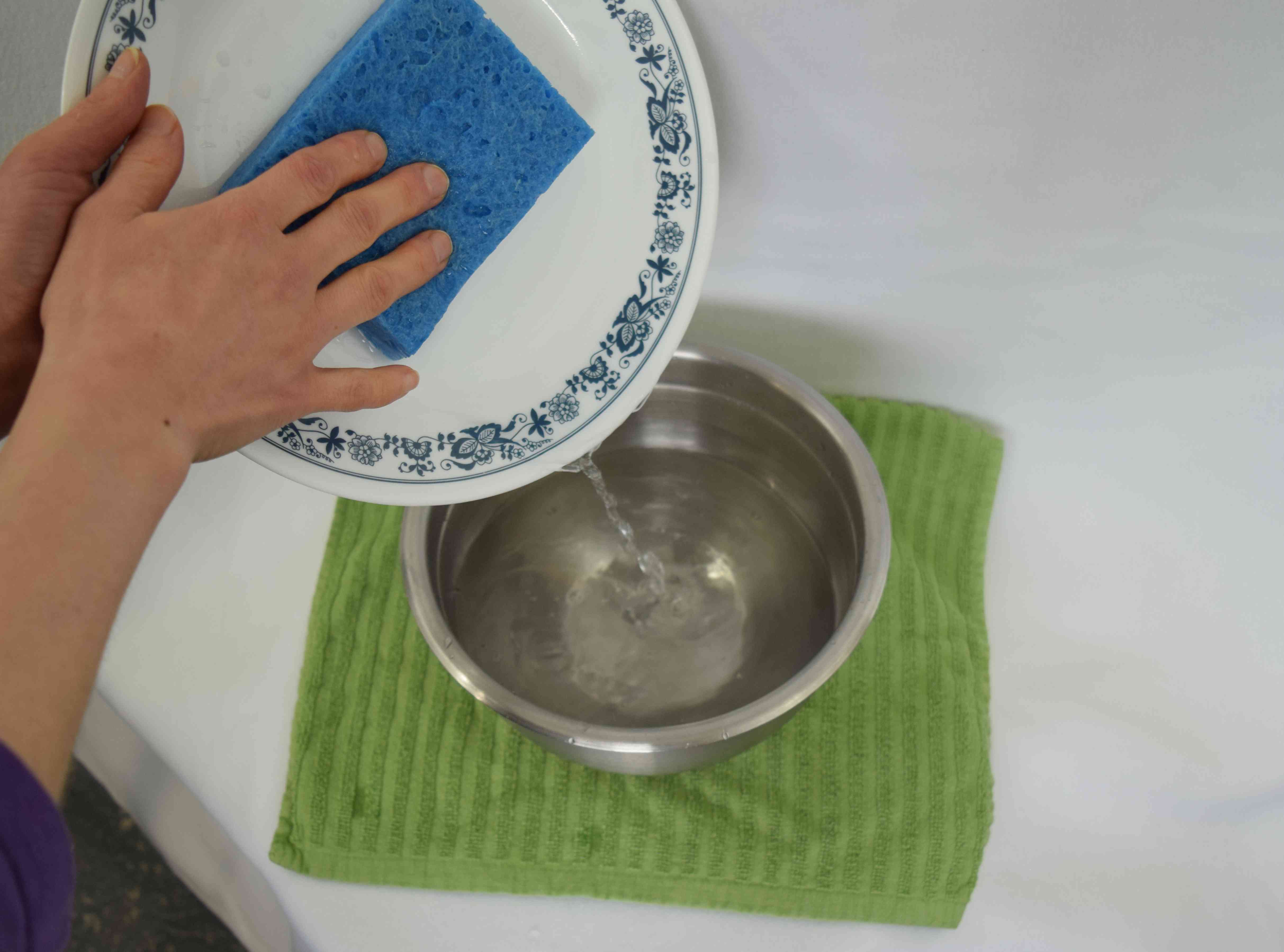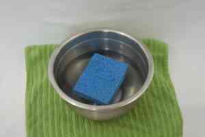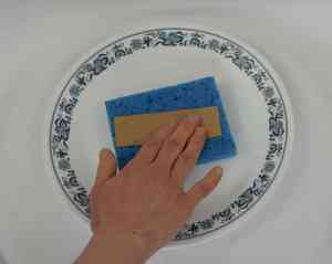 Place the sponge on a plate, then gently press on the sponge while holding the plate at an angle over the bowl to squeeze a little of the water out. You want your sponge almost saturated, but not quite. The sponge should not be sitting in a puddle of water on the plate. The exact amount of water you need in your sponge will vary depending on humidity – you’ll want your sponge a little wetter if the air is dry. You’ll have to experiment to get it just right. Re-wet your sponge every 15-30 minutes.