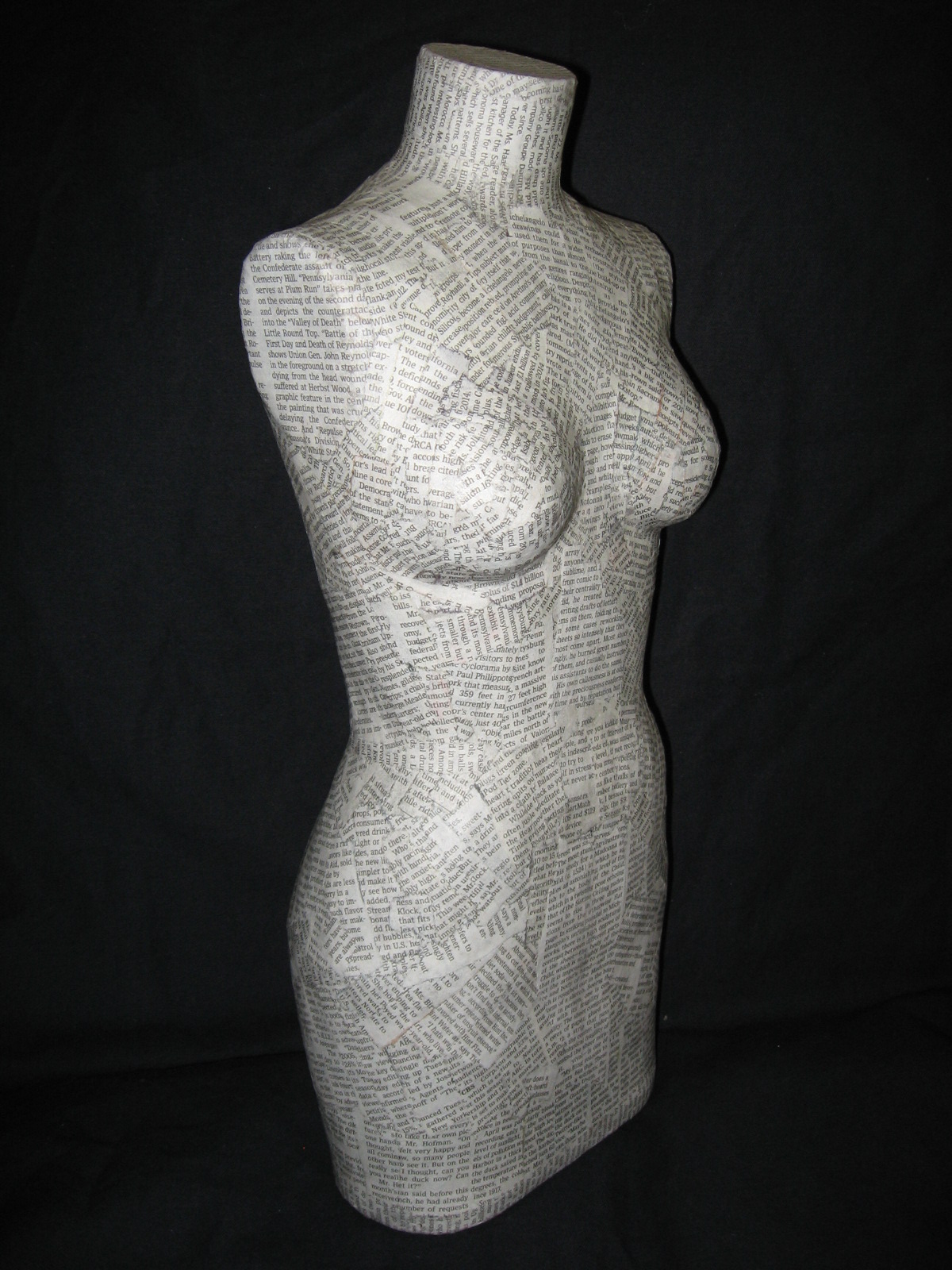 Mix equal amounts of PVA glue (e.g. Elmer’s Glue-All) and water. I like to apply this with a paint brush:  Use a brush to apply some glue mixture to your form, place a strip of newspaper over it, and then brush more glue mixture on top of the paper.